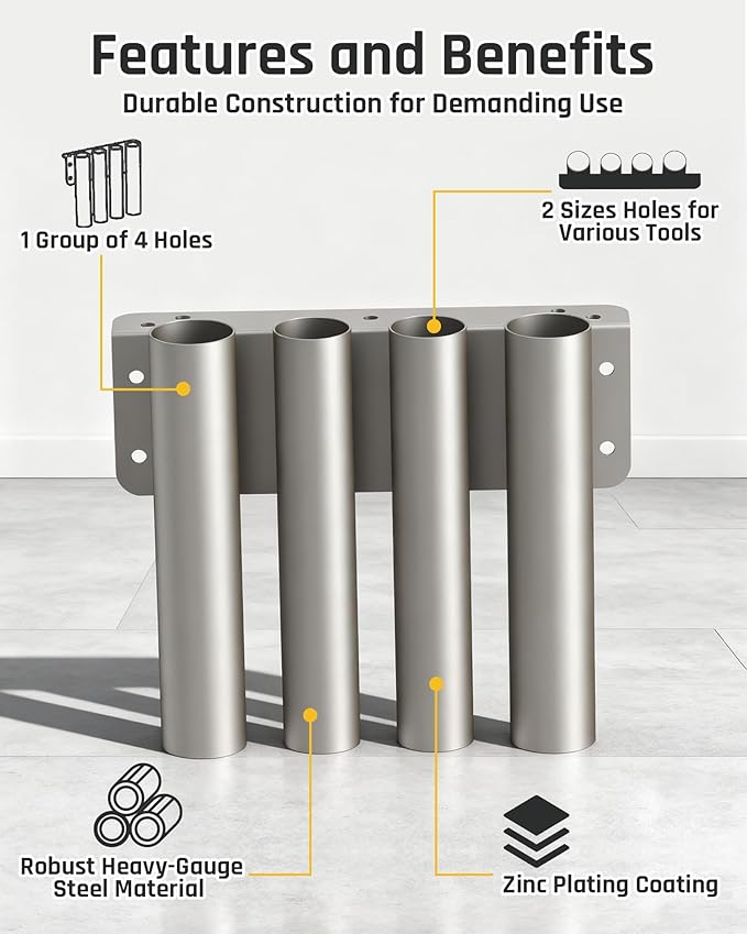 - SECURE TOOL STORAGE - Safely holds up to 8 long-handled tools like shovels, rakes, brooms, and hoes-preventing loss or accidents on the highway or road.