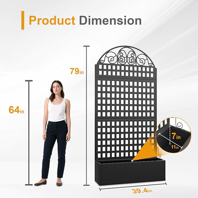 - 【Built-in Drainage Holes】Dimensions79 inches (H) x 39.4 inches (W) x 11.8 inches (D). This outdoor planter with trellis is perfectly sized to hold ample soil for plant growth. The drainage holes allow excess water to drain easily, preventing waterlogging and helping plants maintain the appropriate humidity level for optimal growth.