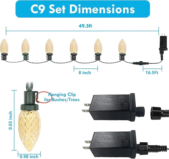 - [Guarantee & Service]: The package includes two C9 string lights and plugs. If you have any questions or concern, please fell free to contact us, we also welcome any inquires before purchase. We promise to reply to you within 24 hours.