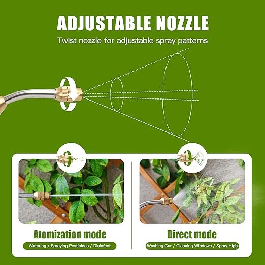 - 【MULTI SCENARIO APPLICABLE NOZZLE SYSTEM】Lawn sprayer is equipped with adjustable nozzle, supporting different spraying modes such as fine mist, column. Switch freely according to tasks to accurately meet diverse spraying needs from delicate flowers and grass to large lawns. The built-in filter effectively prevents clogging, ensuring long-term efficient operation of the machine and smoother spraying.