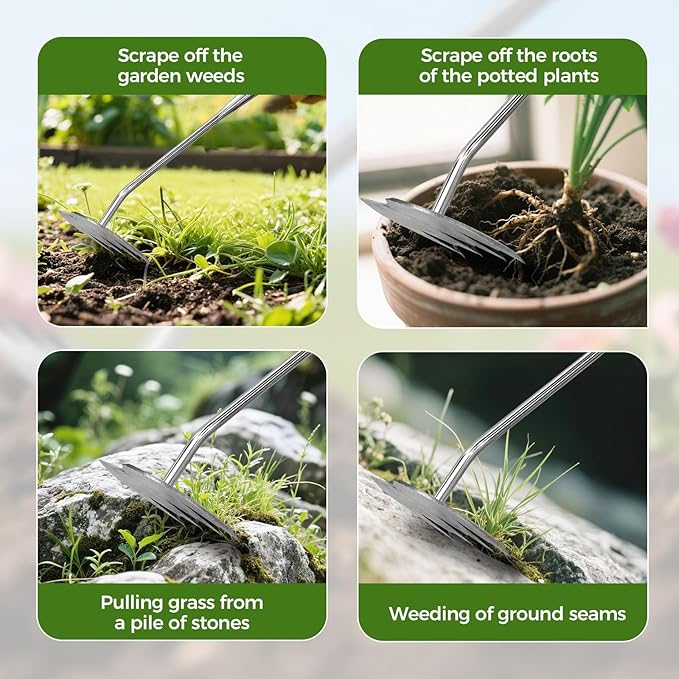 - 🪓 [2025 New Upgraded Weeding Tool] With a unique four-tooth structure design, it can complete root prying, soil loosening and weeding with a single operation. Easily deal with deep-rooted thistle weeds and stubborn plants such as dandelions. The newly upgraded extendable handle design is suitable for both standing and squatting positions, providing an efficient and effortless gardening experience.