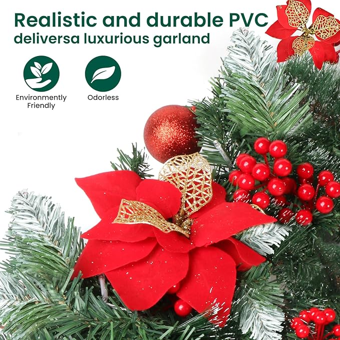- đđ ăLush, Luxurious and Fantastic DesignăOur beautifully crafted 9 feet Christmas garland features 220 lush branch tips that perfectly mimic snow-dusted spruce branches, and our Christmas garland with lights also features a vibrant mix of artificial and natural elements, including bright red berries, glossy red balls, striped red balls, red ribbon bows, large red flowers, glitter pink balls and delicate pine needles, bringing a lively, festive feel and a touch of winter wonderland to your home.