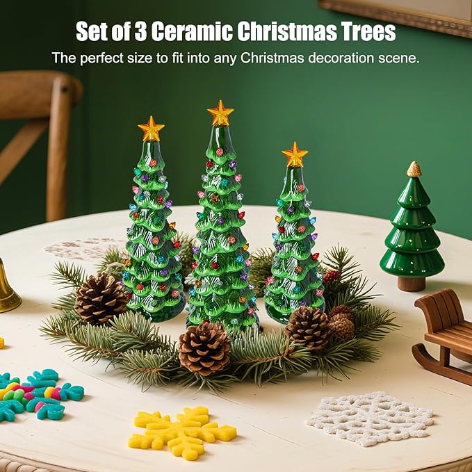 - 【 Ceramic Christmas Tree Set of 3 】 - This decoration set includes 3 ceramic Christmas trees with colored lights. The sizes are: 11.5in * 3.62in, 10in * 3.35in, and 8.86in * 2.95in. It’s battery-powered with colorful plastic bulbs. Just turn it on, and the beads and star on top will light up beautifully – perfect for jazzing up your holiday table
