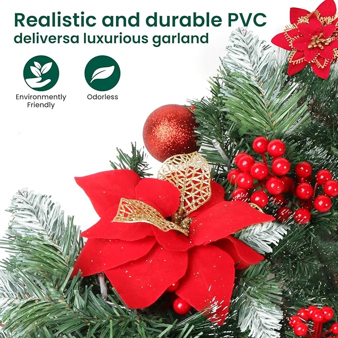 - Realistic Festivity, Worry-Free Safety: Run your fingers over the plump red fruits and shiny metallic ornaments—they look so lifelike, guests might mistake them for fresh picks! Crafted with years of expertise, this garland feels full and lush, instantly filling your home with that “just stepped into a holiday wonderland” feeling. Made of fire-resistant PVC and shatterproof materials, you won’t stress about accidental knocks (thanks to kids or pets) or fire risks—just pure, carefree holiday joy.