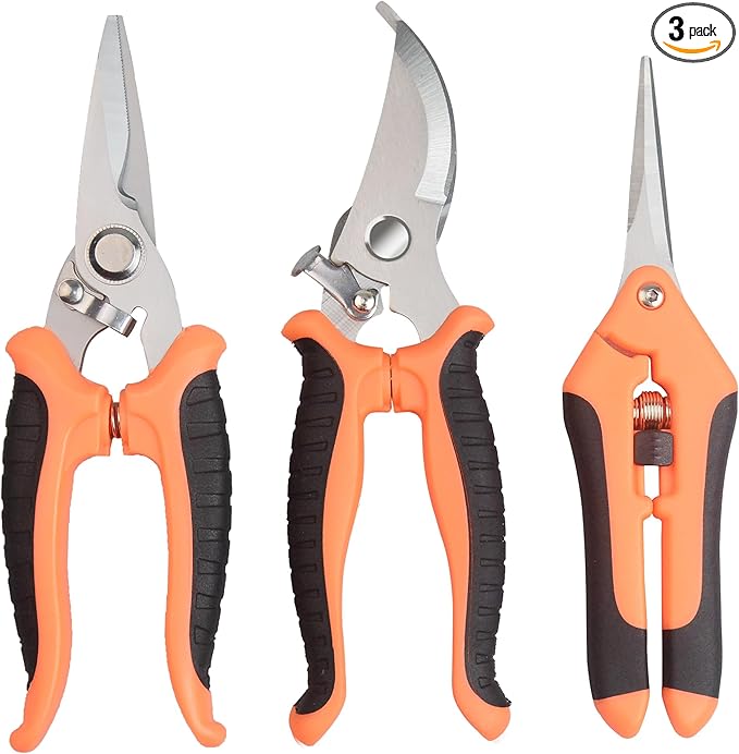 - Premium 3-Piece Gardening Pruning Shears Set: This professional-grade kit includes bypass pruners, straight snips, and floral shears, perfect for trimming branches, stems, roses, hedges, herbs, succulents, and even tomato plants. Made of stainless steel with ergonomic handles, it ensures effortless cutting for left- or right-handed users. The sharp blades provide clean cuts, while the safety lock prevents accidents. Ideal for small or large tasks