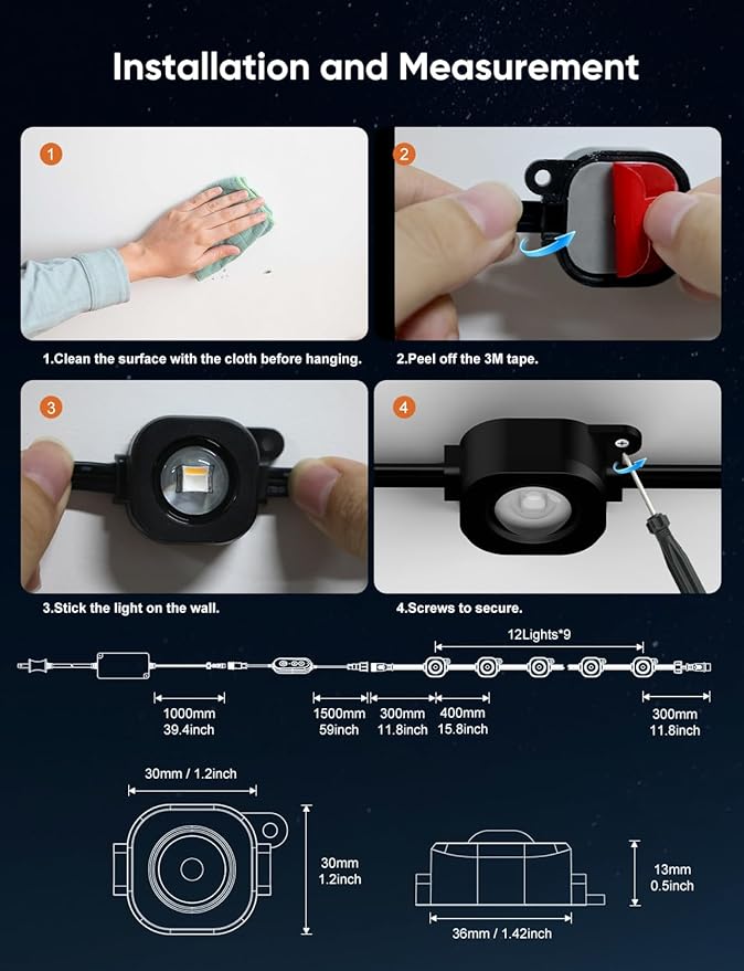- 【What You Get】There is 150ft of led permanent light, a user manual, a power adapter, 2 extension cables, a control box, a remote control, and a screw mounting kit. It’s a complete package to bring your outdoor space to life right out of the box—no extras needed.