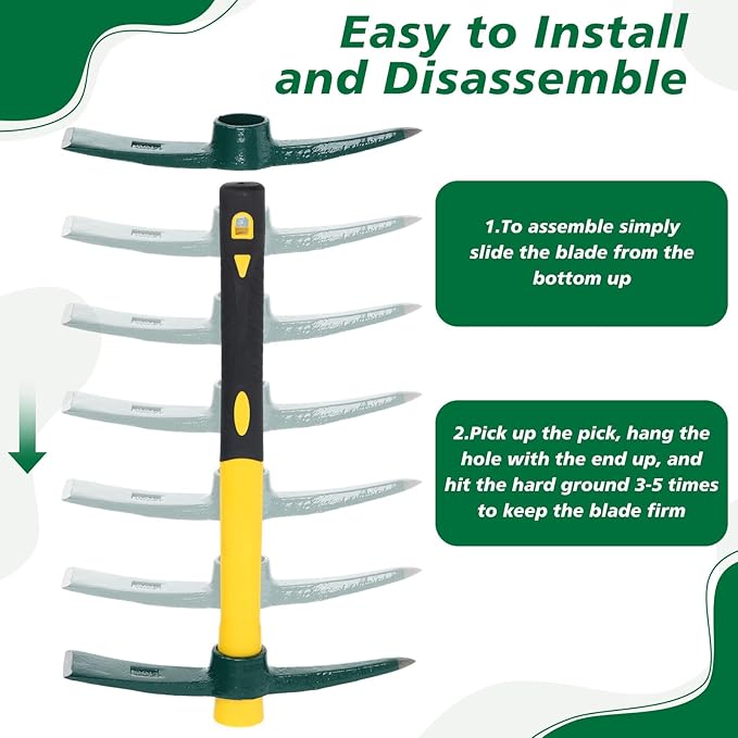 - Double Headed Picks: the garden pickaxe features a dual head design; The side with the pick is suitable for loosening soil and digging holes, and the other side equipped with a hoe mainly applied for weeding and cutting off small shrub roots, making it an ideal tool for any garden or land management