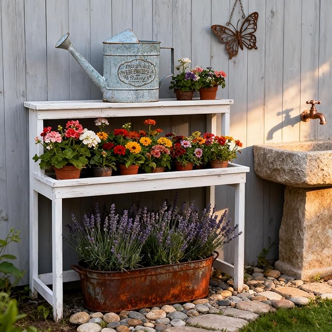 - 【UNIQUE RUSTIC DESIGN】 Boasting a vintage - inspired look, this watering can features a distressed, light - blue and speckled finish that gives it an aged, well - loved appearance. The embossed "magnolia greenhouse and nursery" label adds a touch of old - fashioned charm, making it a standout piece for both gardening and home decor.