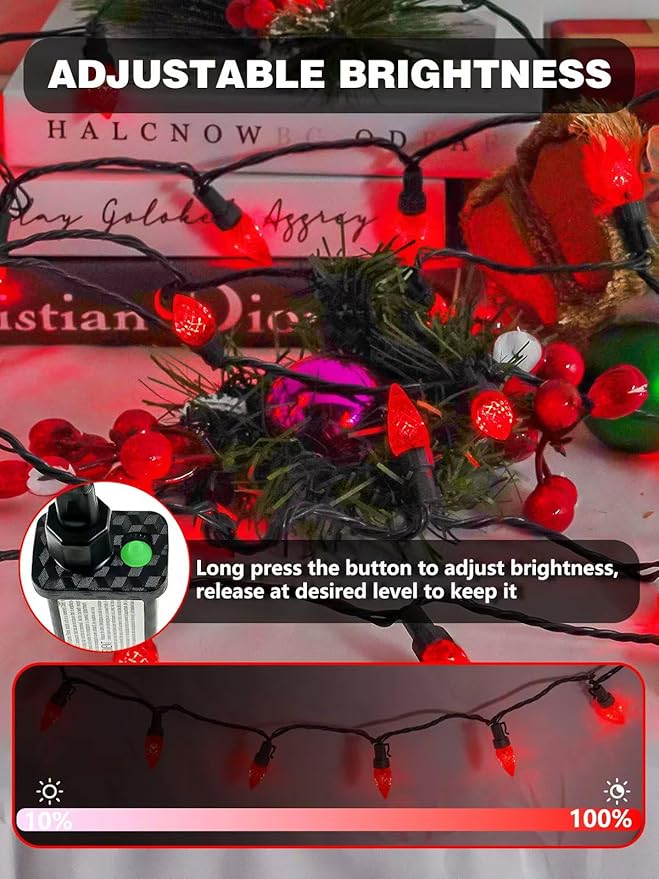 - Christmas Tree String Lights: Each string lights feature 100 individual faceted strawberry C6 LED bulbs in red, 33FT plus 9.8ft lead wire, space between LEDs: 3.9 inches. One pack contains 2pcs of string lights, total 66FT string lights with 200 LED C6 bulbs