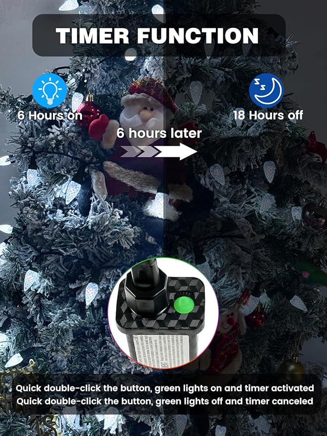 - Timer Function and Adjustable Brightness: Quick double-click the adapter button (green indicator) to activate the timer—the fairy lights will automatically turn on for 6 hours and off for 18 hours. Quick double-click button to cancel the timer. Long-press the button to adjust Brightness(dim or brighten)