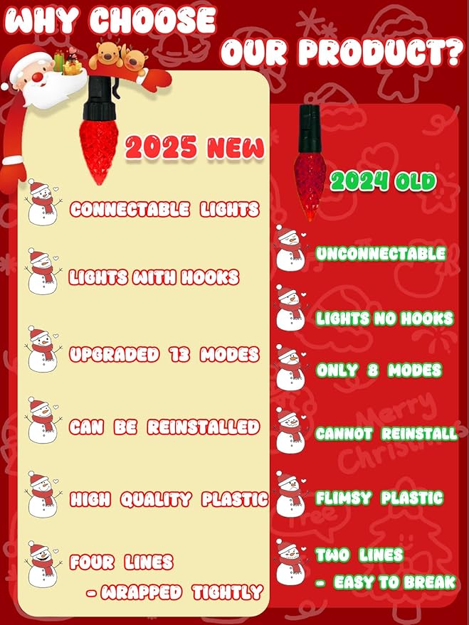 - IP44 Waterproof C6 Lights for Outdoor Use: The waterproof twinkle lights can be used both indoor and outdoor. Whether it's raining, snowing or windy, our lovely C6 strawberry lights will still work great in your yard. These fairy lights are spirally connected and are very secure. The durable and solid plastic shell will not be broken by snow or high temperature weather, so you can use our light string outdoors with confidence. It will be the most shining part of your 2025 Christmas season.