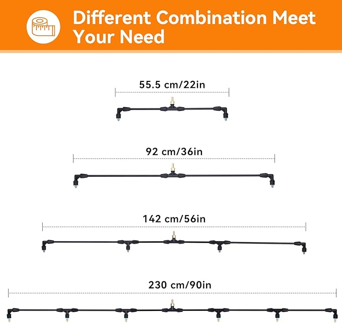 - 【3-in-1 Assembly Flexibility】Customize your sprayer boom in seconds: Build a 90-inch 6-nozzle wand for large fields, a 56-inch 4-nozzle setup for gardens, or a compact 36-inch 2-nozzle unit for targeted spot treatment.