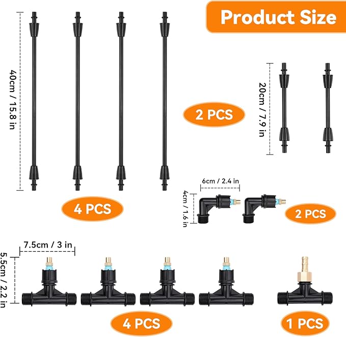 - 【6 Adjustable Metal Nozzles】The boom wand kit comes with 6 brass nozzles that can be easily rotated and adjusted, providing a customizable spray range from a powerful jet stream to a gentle mist spray, suitable for a variety of tasks—from watering delicate plants to treating large areas.