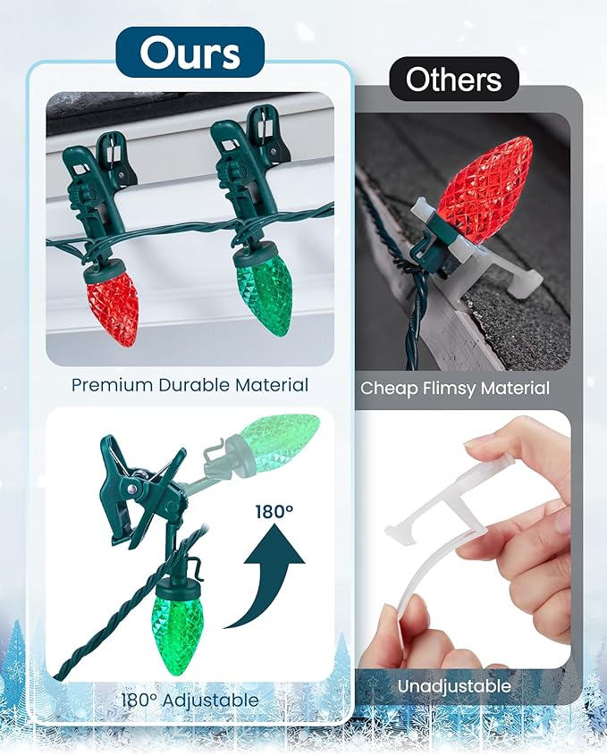 - 【One-second Set up & Removable Clips】 These energy efficient C9 LED Christmas lights Outdoor come with spring-loaded clips for quick installation, offering the option of fastening safely in a wider variety of settings (clips can also be removed if deemed unnecessary). Compared with regular roof clips for christmas lights outdoor C9, the spring-loaded clips can more firmly and securely clamp objects such as the roofline, railing or tree. Very suitable for outdoor and indoor use