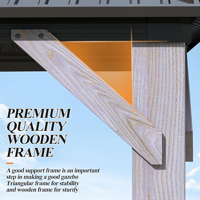 - ⛱️USEFUL ACCESSORIES: Our patio wooden frame with metal canopy gazebos are double-roofed and equipped with netting and curtains for complete privacy and protection, offering excellent protection against UV rays. Netting provides ventilation and curtains provide privacy, allowing you to enjoy the outdoors in complete peace and without any distractions in using the double waterproof hardtop top gazebo
