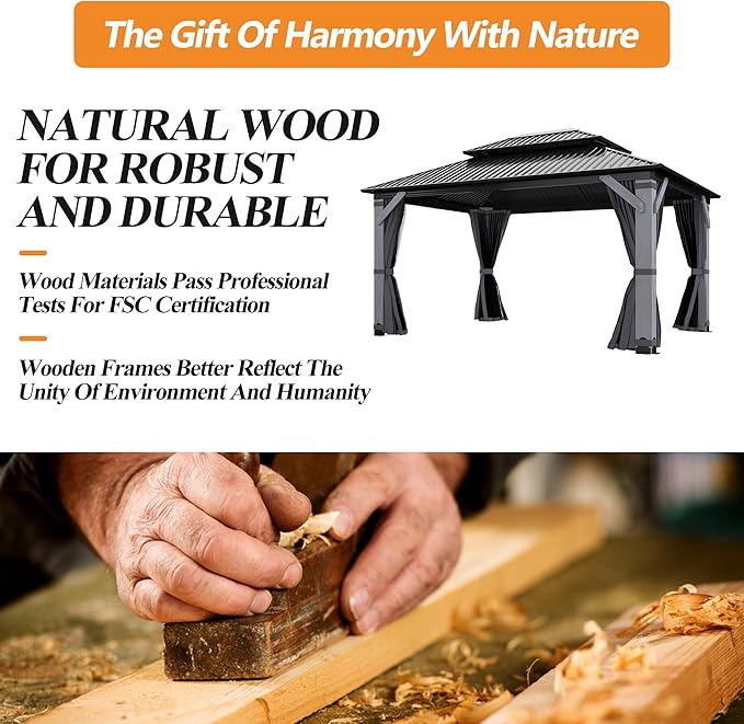 - ⛱️PREMIUM QUALITY WOOD FRAME: Our wooden gazebos are constructed with high quality wood frames that are FSC certified to ensure the patio vented roof gazebo durability and stability. Made of sturdy wood that is durable and long-lasting, providing you with a long-lasting outdoor deck wood gazebo. Besides, we maintain the ecological balance and biodiversity of our forests by complying with FSC standards. And promoting ecologically sustainable development in making this wood frame gazebo