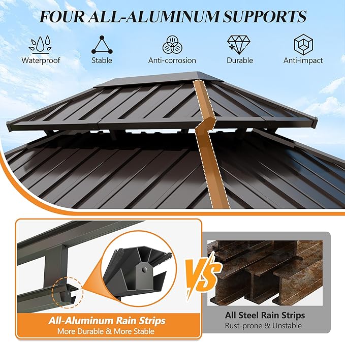 - ⛱️VENTED DOUBLE-TOP DESIGN: Our metal top wooden gazebos feature a double-top design that allows for optimal air circulation to keep you cool and comfortable on hot summer days. On rainy days, double-topped vertical stripes for easy rainwater run-off, and the metal hardtop gazebo effective system also helps to relieve pressure on the galvanized steel gazebo top, ensuring a safe and secure outdoor space