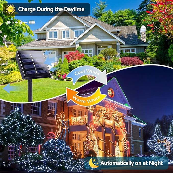 - 2025 New Upgraded Warm White and Cool White Solar Christmas Lights!!! More Brighter with Upgraded Bulbs , More Durable with High Quality 1800mAh Built-in Battery, Quick Charging Technology with Larger Solar Panel, IP65 Waterproof Performance, Flexible Sliver Wire