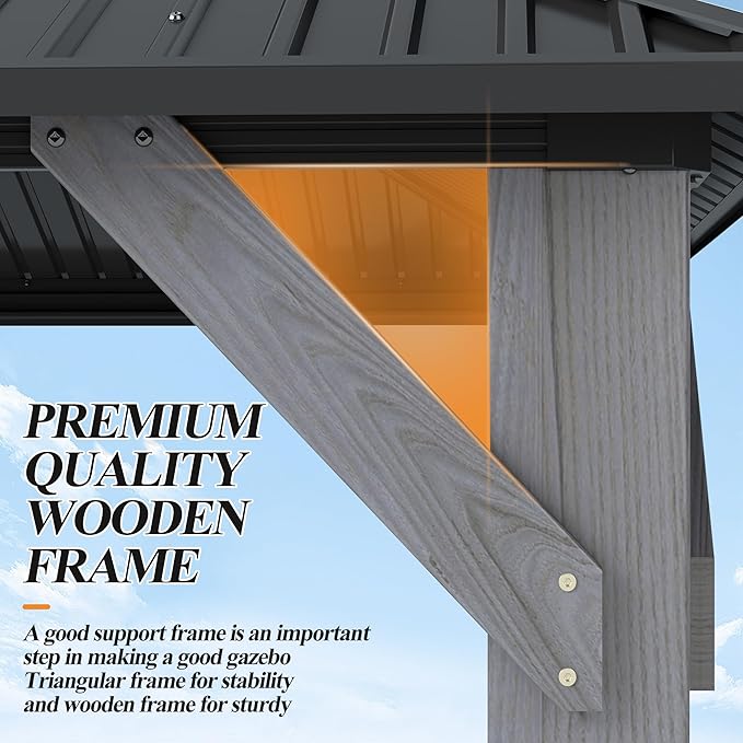 - ⛱️USEFUL ACCESSORIES: Our patio wooden frame with metal canopy gazebos are double-roofed and equipped with netting and curtains for complete privacy and protection, offering excellent protection against UV rays. Netting provides ventilation and curtains provide privacy, allowing you to enjoy the outdoors in complete peace and without any distractions in using the double waterproof hardtop top gazebo