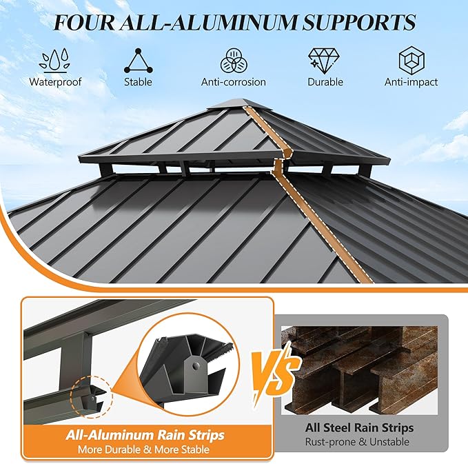 - ⛱️VENTED DOUBLE-TOP DESIGN: Our metal top wooden gazebos feature a double-top design that allows for optimal air circulation to keep you cool and comfortable on hot summer days. On rainy days, double-topped vertical stripes for easy rainwater run-off, and the metal hardtop gazebo effective system also helps to relieve pressure on the galvanized steel gazebo top, ensuring a safe and secure outdoor space