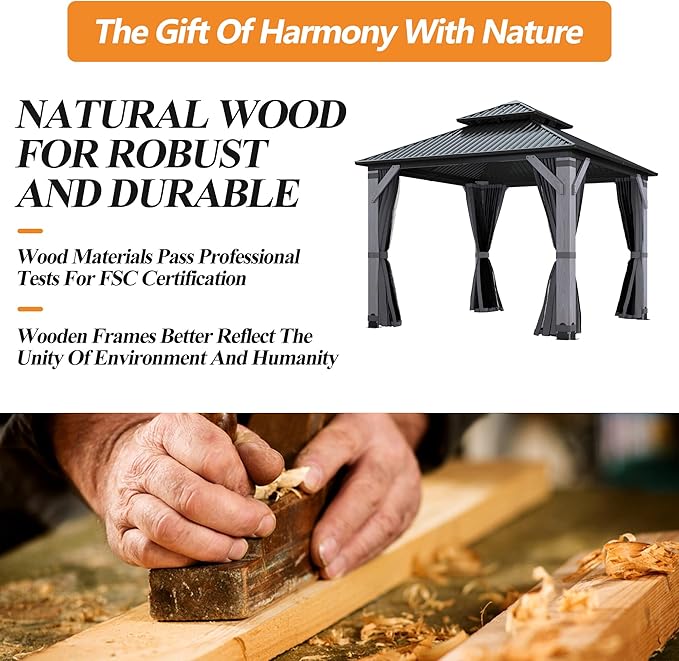 - ⛱️PREMIUM QUALITY WOOD FRAME: Our wooden gazebos are constructed with high quality wood frames that are FSC certified to ensure the patio vented roof gazebo durability and stability. Made of sturdy wood that is durable and long-lasting, providing you with a long-lasting outdoor deck wood gazebo. Besides, we maintain the ecological balance and biodiversity of our forests by complying with FSC standards. And promoting ecologically sustainable development in making this wood frame gazebo