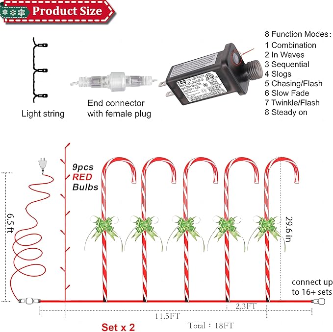 - 8 Flashing Modes Christmas Landscape Lights - Make more fun for Christmas, our brilliant Christmas candy cane come with 8 lighting modes flashing effects, Coming with UL Listed Adapter, Transfer The 110V to 30V to meet all your needs