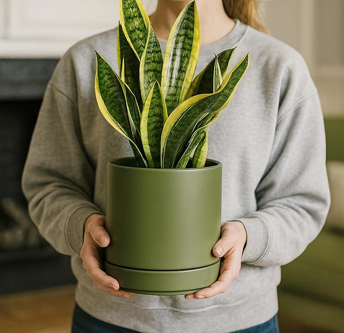 D'vine Dev Set of 2 Plants Pots, 6.5 Inch Ceramic Planter Pot for Plants with Drainage Hole and Saucer, Olive, 94-V-C-J