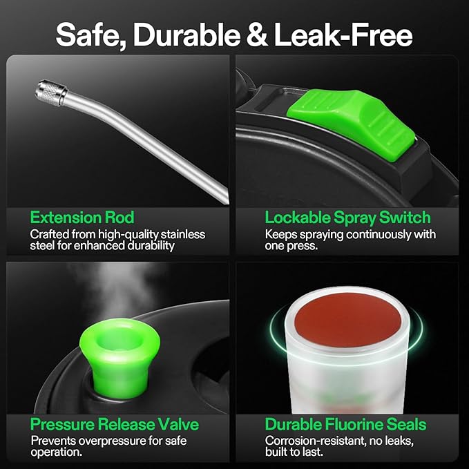 - Durable & Leak-Resistant Seals: Upgraded fluororubber gaskets inside the pump sprayer provide excellent resistance to corrosion and wear; This ensures longer service life and reduces the risk of leaks while spraying