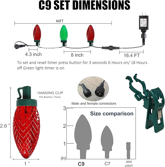 - Timer and Safety: Press the button on the adapter for a few seconds; when the green light on, the timer function is activated, with 6 hours on and 18 hours off. The 29V low voltage ensures that the lights remain at a low temperature even after hours of use, ensuring safety. The C9 string light bulb covers are made of high-quality and sturdy materials designed to withstand the elements and provide long-lasting performance