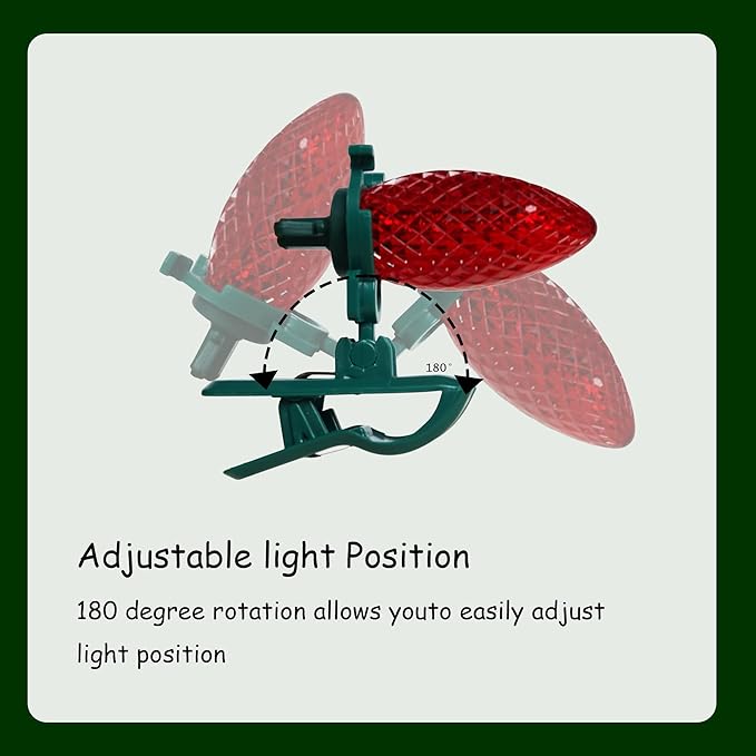 - Spring Clips: Our C9 Christmas lights feature spring clips that provide a convenient and secure setup. The clips offer 180-degree adjustability, allowing the clip arm to rotate for optimal illumination in any desired direction. This ensures that the lights can be firmly and securely fastened to various surfaces such as roofs, railings, or trees