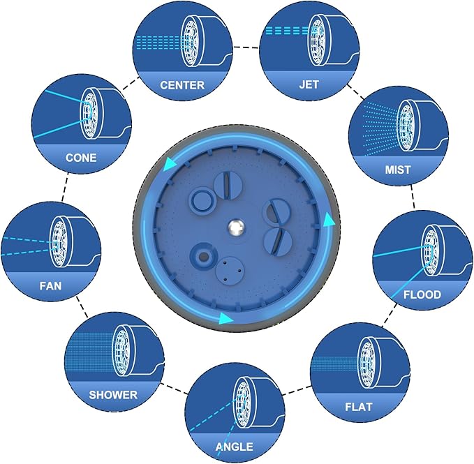 - 【9 Versatile Watering Modes】Rotate the dial to switch between 9 patterns: Shower, Flat, Full, Mist, Jet, Center, Cone, Angle, and Vertical. Ideal for high-pressure patio cleaning, angled car washing, gentle pet rinsing, or misting delicate flowers—all needs covered with one nozzle.