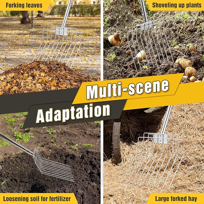 - 【Versatile for Gardening & Farming】From turning compost and aerating soil to harvesting potatoes and moving hay bales, this pitchfork is built to handle a wide range of tasks. It’s an essential, multi-purpose tool for gardeners, landscapers, and small-scale farmers alike.