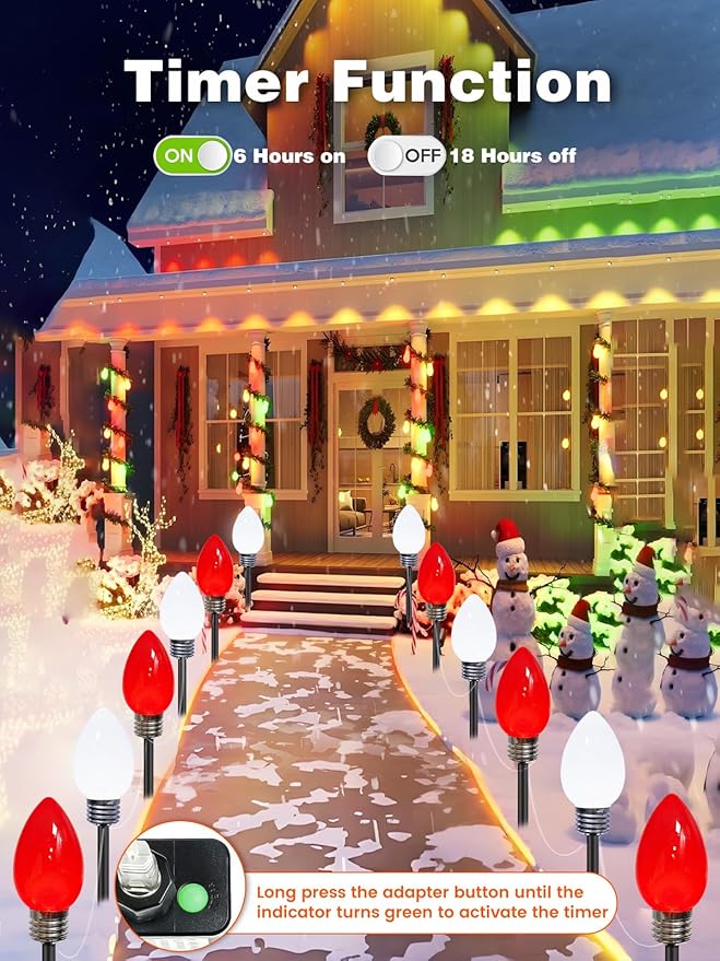 - C9 Christmas Lights with Timer: Long-press the button on the plug for 3 seconds to set or cancel the timer. When activated, the timer runs on a 6-hour-on / 18-hour-off cycle and is indicated by a green LED light. These path lights create a warm, festive atmosphere, perfect for patio, walkway, and garden decor during Christmas
