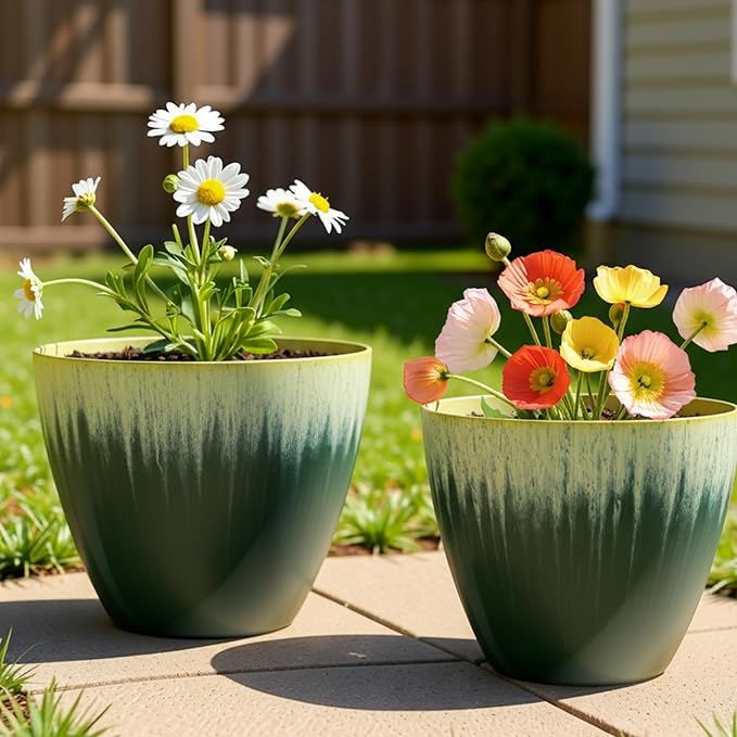 8 inch Plant Pots with Drainage Holes, Pack of 4 Plastic Flower Pots Indoor, Modern Glossy Finishing Planter for Indoor Outdoor Plants (Green Glaze, 4 Pack)