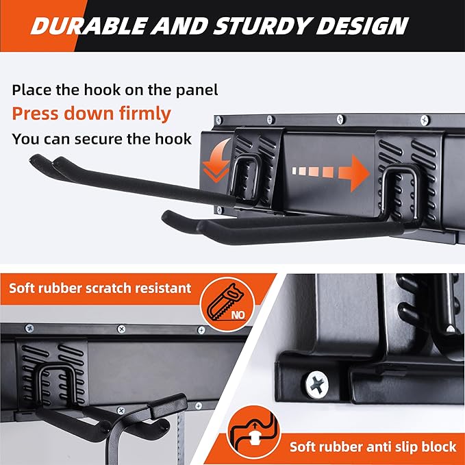 - Amazing Load-bearing Capacity: Garage Storage Rack is designed specifically for storing tools, featuring a sturdy steel frame and reinforced hooks. Tool Organizer Wall Mount thickened siding prevents deformation, which helps support weights of up to 400 pounds. The carefully designed soft rubber anti-slip block on the hook ensures stability, making your tools secure for storage.