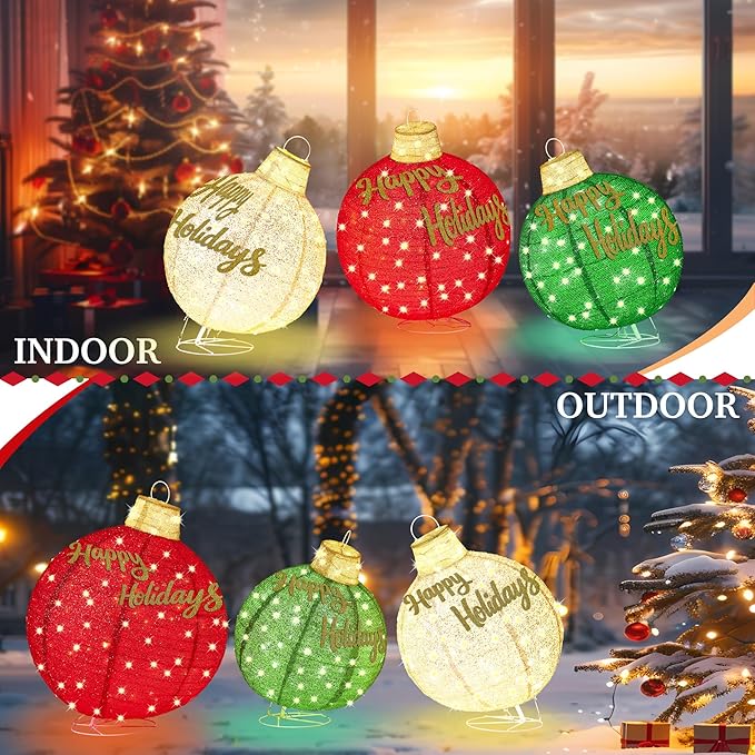 - 【CHRISTMAS ORNAMENTS】Set includes 2 sizes (one 36 inches and two 31 inches) Christmas ball ornaments. Light up your Christmas yard decor outdoor red and green balls, make your outdoor Christmas decorations shine, set a festive mood and bring unlimited Christmas fun.