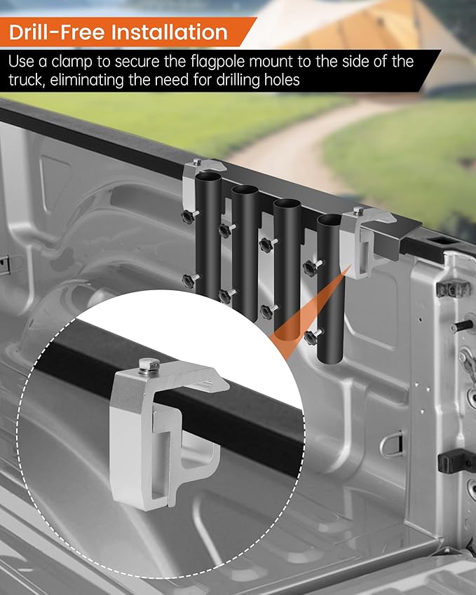 - Drill-Free Installation: The flag mount for truck comes with two clamps. Use the clamps to secure the flag pole to the side of the truck bed and tighten with a wrench, eliminating the need to drill holes in your beloved truck and preserving its aesthetic