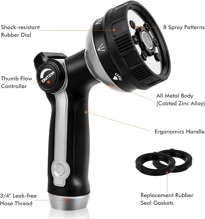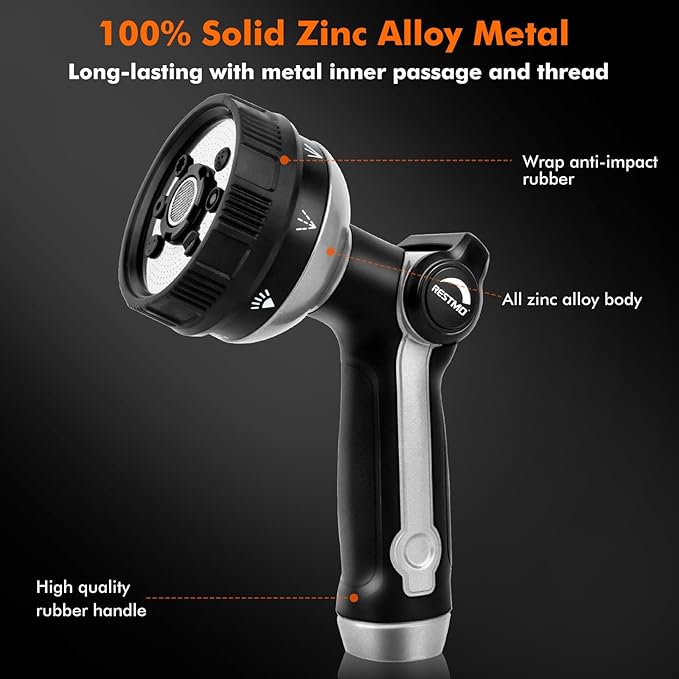 - Heavy Duty Metal Hose Nozzle: Constructed with premium zinc-alloy material, this hose nozzle sprayer is solid & strong to resist daily drops and shocks. The bronze powder painting, TPU coating and rubberized bezel dial can enhance durability & flexibility and withstand hard impacts & heavy force. A long-lasting garden hose nozzle you can count on many years.