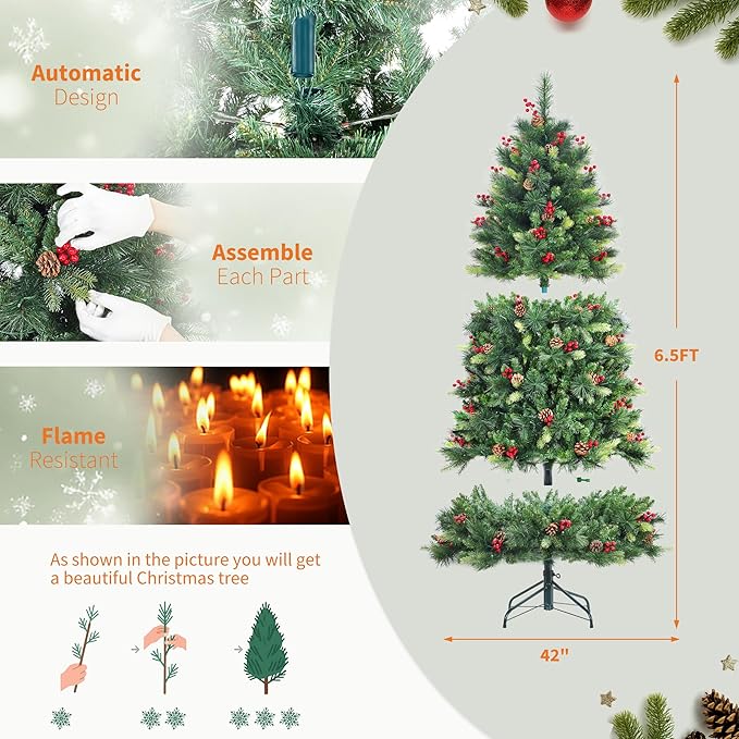 6 FT Pre-Lit Artificial Christmas Tree, Norway Spruce, 250 Warm White Light, Automatic Hinge Expansion, Artificial Christmas Pencil Tree with Pine Cones, Holly Berries & Stand, Green