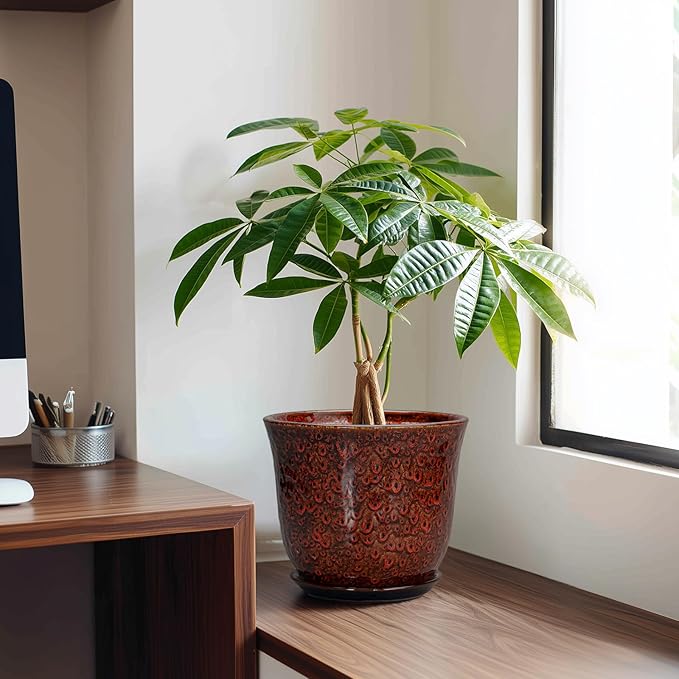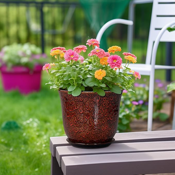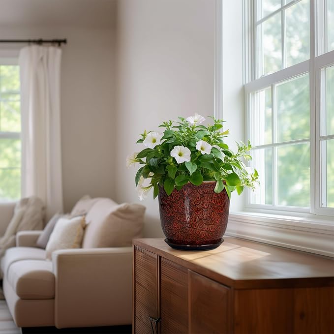 Ceramic Planter - 8 Inch Plant Pot for Indoor Outdoor, Ceramic Flower Pots with Drainage Hole and Saucer, Round Planter, Decorative Plant Pot, Room Home Apartment Decor, Gift for Women, Red