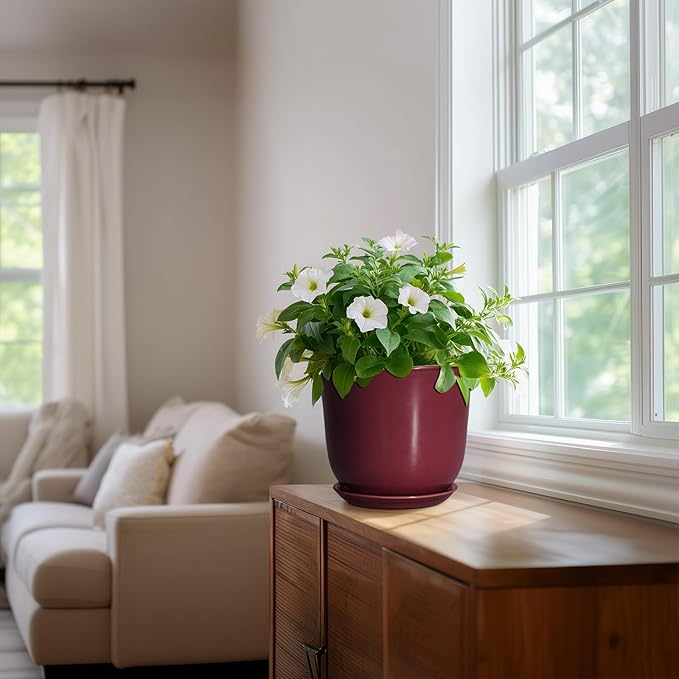 Ceramic Planter - 8 Inch Plant Pot with Drainage Hole and Saucer, Round Planter for Indoor Outdoor, Modern Flower Pots, Porch Garden Home Decor, Gifts for Plant Lovers, Red