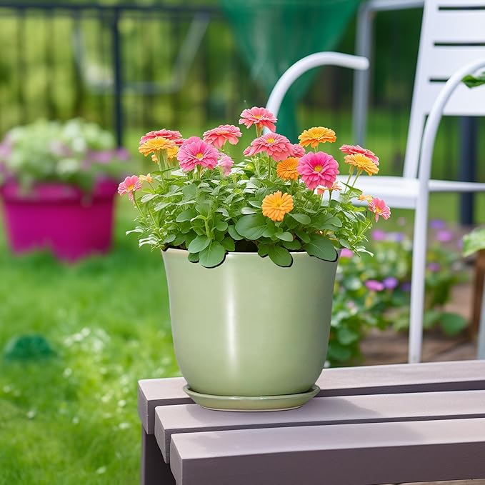 Ceramic Flower Pots - 8 Inch Plant Pot Drainage Hole and Saucer, Round Plant Pot with for Indoor Outdoor, Modern Planter, Decorative Planter, Home Porch Room Decor, Housewarming Gift, Green