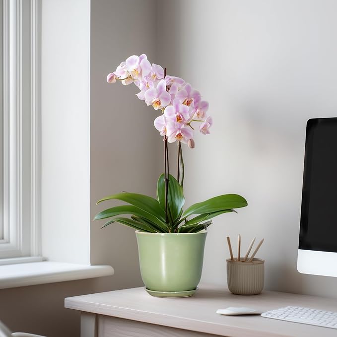 5.6 Inch Plant Pot - Ceramic Pots for Plants Indoor Outdoor, Round Orchid Succulent Pot with Drainage Hole and Saucer, Modern Small Planter, Home Room Window Decor, Plants Lover Gift, Green