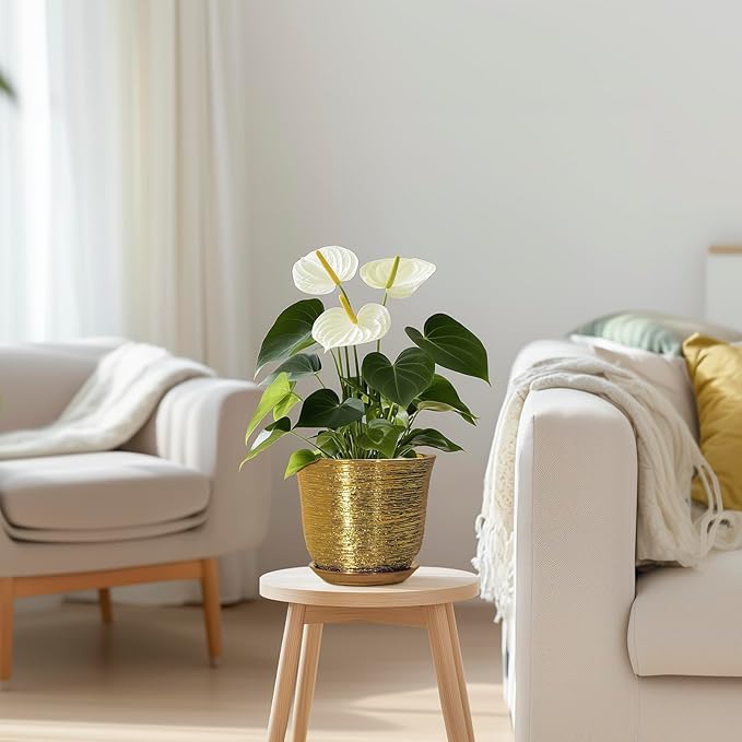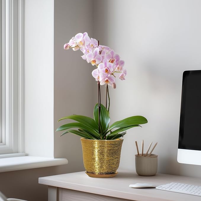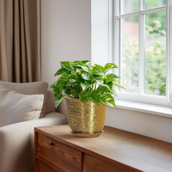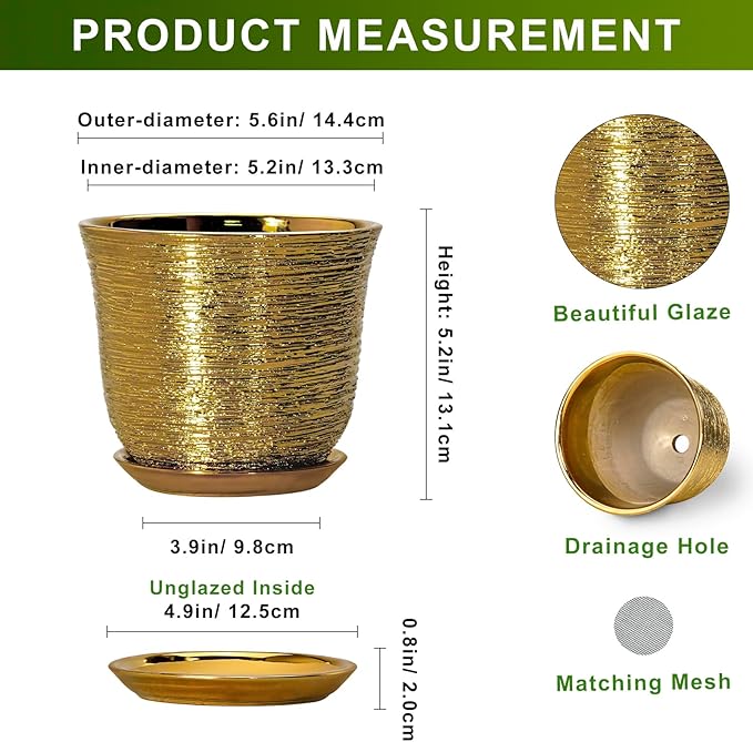 5.6 Inch Plant Pot - Ceramic Planter for Indoor Outdoor, Round Succulent Orchid Pot with Drainage Hole and Plant Saucer, Modern Decorative Planters, Living Room Decor, Gifts for Women, Gold
