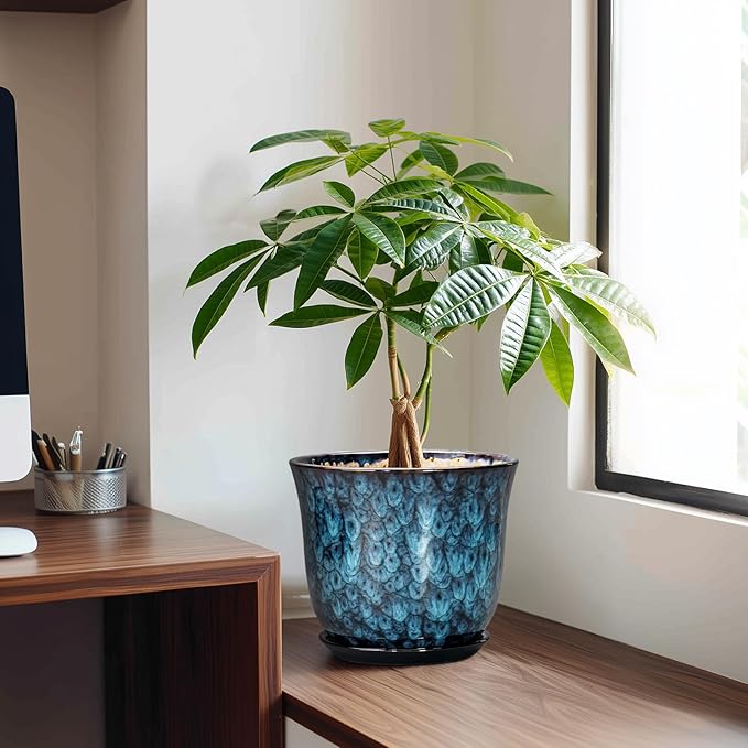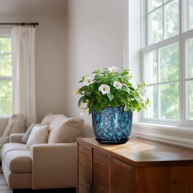 8 Inch Plant Pot - Ceramic Planter for Indoor Outdoor, Round Planter with Drainage Hole and Saucer, Modern Planters, Flower Pots, Apartment Porch Room Home Decor, Gardening Gifts, Blue