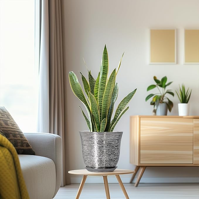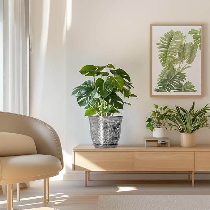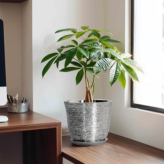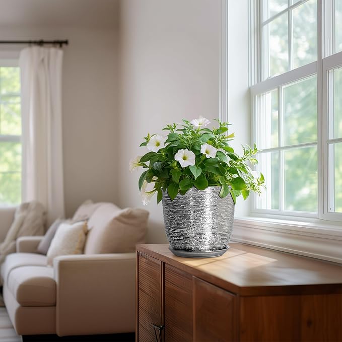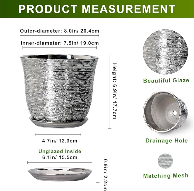 Ceramic Pots for Plants - 8 Inch Plant Pot with Drainage Hole and Saucer, Round Planters for Indoor Outdoor, Modern Planter, Decorative Flower Pots, Home Decor, House Warming Gifts, Silver