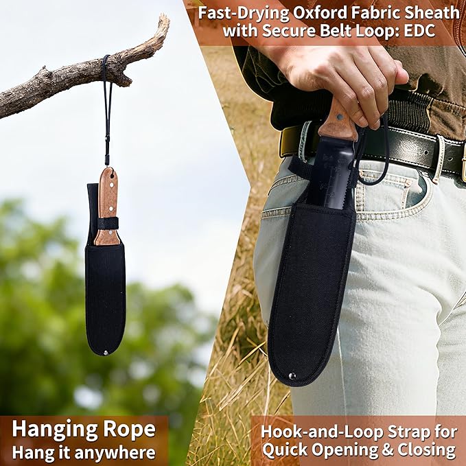 - [ Secure & Convenient Carry with Durable Sheath & Included Lanyard] Features a rugged Oxford fabric sheath with a hook-and-loop strap and belt loop for secure, hands-free carry. The included lanyard provides a secure grip around your wrist during use and a handy way to hang your knife on a branch for quick access during breaks. Perfect for gardening, camping, and as your ultimate EDC tool.