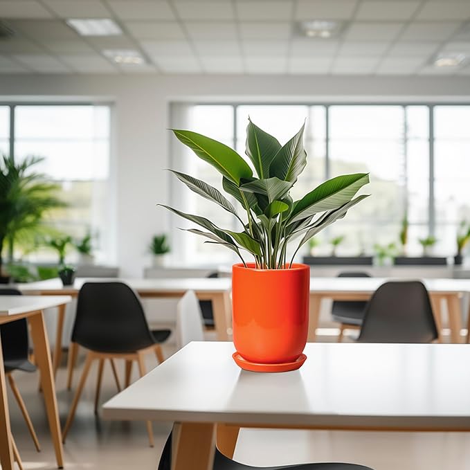 Ceramic Planter - 8 Inch Plant Pot with Drainage Hole and Saucer, Cylinder Round Modern Flower Pot for Indoor Outdoor Plants, Plant Lover Gifts, Garden Office Home Decor, Orange