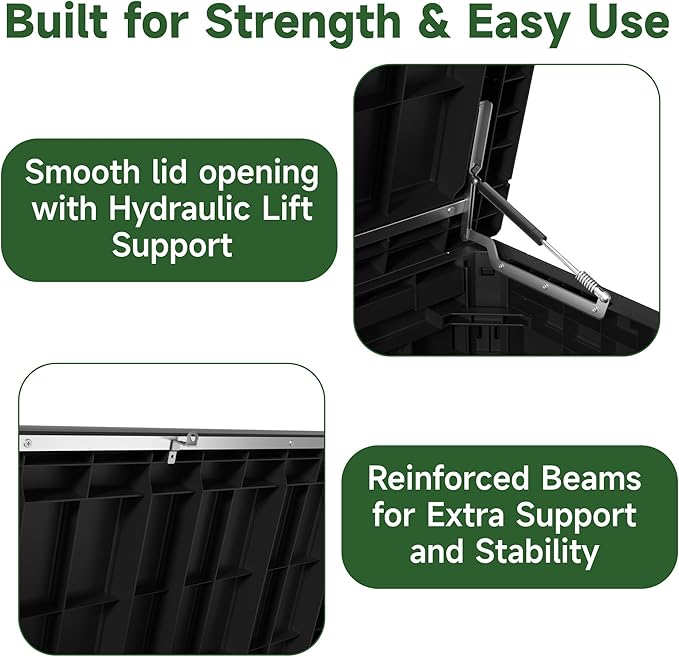 - SAFETY & LOCKABLE FEATURE - Equipped with a hydraulic lid support for smooth and safe opening and closing, preventing accidental pinching. The integrated lockable mechanism adds an extra layer of security for your outdoor valuables.