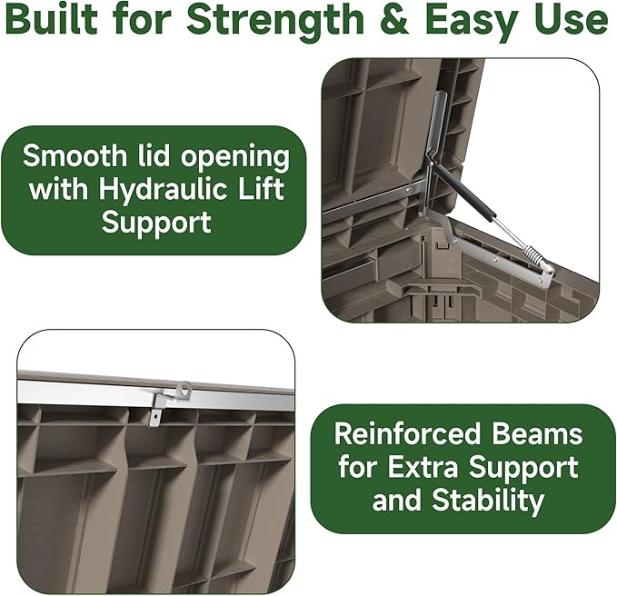 - SAFETY & LOCKABLE FEATURE - Equipped with a hydraulic lid support for smooth and safe opening and closing, preventing accidental pinching. The integrated lockable mechanism adds an extra layer of security for your outdoor valuables.